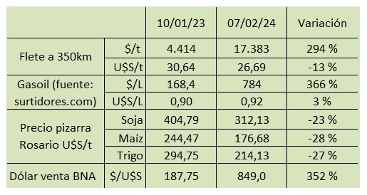 Para el análisis se utilizó la cotización del dólar venta publicada por el Banco Nación para las dos fechas, 187,75 $/U$S al 10 de enero del 2023 y de 849,0 $/U$S al 07 de febrero del 2024.