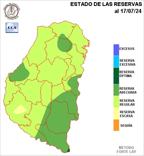 No hay ninguna razón importante como para considerar que habrá cambios sustanciales en la oferta de agua durante la transición julio-agosto. La provincia de Misiones es la única que estaría en condiciones de sumar precipitaciones y volver a recoger guarismos cercanos a los normales. Para la región pampeana, incluyendo la provincia de ER, no se descarta alguna corrección menor en los primeros diez días del próximo mes, pero difícilmente esto se consolide con acumulados que permitan alcanzar valores normales.