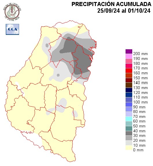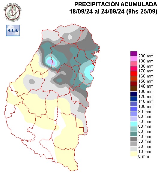 Por otra parte, la precipitación promedio acumulada en la provincia entre junio a septiembre fue la más baja de los últimos 21 años, lo cual impactó negativamente en el potencial de rendimiento del trigo donde en muchos sitios se visualizaban claros síntomas de estrés hídrico (menor desarrollo y acartuchado de las hojas). Afortunadamente, las recientes precipitaciones, resultaron un alivio en la caída de producción fundamentalmente en el sector Oeste.
