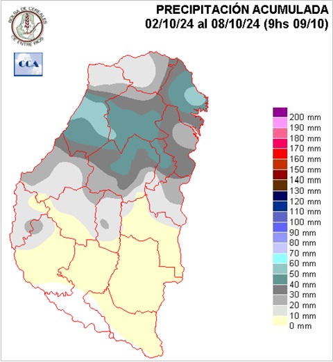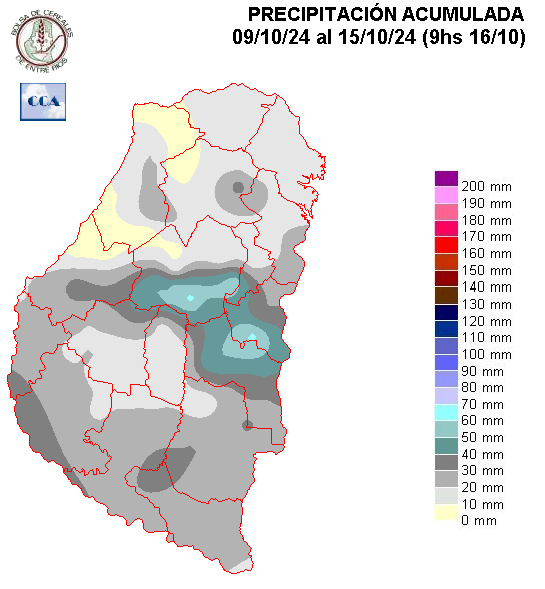 La recirculación de aire húmedo sobre gran parte de la región pampeana, comenzó a cambiar el patrón pluvial en algunos sectores de manera muy significativa. En zonas del sur de CB, centro sur de SF y en menor medida el sur bonaerense, las lluvias se sucedieron en forma alternada entre el viernes 11 y el lunes 14, con áreas donde los registros fueron muy abundantes. Dentro de este contexto, el sur de la provincia fue el que primero comenzó a beneficiarse de esta situación de persistente inestabilidad. La conjunción de la estacionalidad de un sistema frontal y la disponibilidad fue productiva, con cobertura en toda la provincia, aunque no de manera homogénea. Como podemos observar en el mapa, aparece un sector que queda configurado por el sur de Villaguay, norte de Uruguay, sur de Colon y sur de San Salvador, donde las precipitaciones superaron los cuarenta milímetros, con áreas reducidas, casi puntuales donde se reportan marcas que superan los sesenta milímetros. La extensa disponibilidad de mediciones, nos permite detectar como esta zona de lluvias abundantes es compensada hacia Tala y Nogoyá con registros menos productivos. Cuando hacemos una mirada completa del mapa, podemos ver que las lluvias totalizaron valores razonables para una semana de Octubre, en general por recurrencia de eventos y no con despliegue de precipitaciones intensas. Esta forma de llover, aun cuando los milimetrajes no sean todo lo generosos que se requiere, tiene menor grado de escorrentía, se aprovecha más. Esto no quita que la provisión pluvial sigue estando en falta en gran parte del territorio. Lo que está claro, es que estamos viendo el cambio esperado en la dinámica atmosférica. Cuando se observan pasajes frontales, no hay enfriamientos serios y rápidamente los vientos vuelven al este noreste recomponiéndose una circulación que facilita la reorganización del aire húmedo. De hecho, en las últimas horas se han venido concretando algunas lluvias débiles.