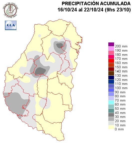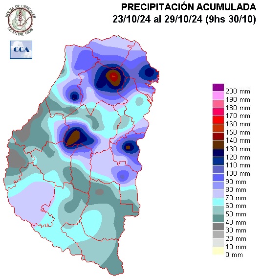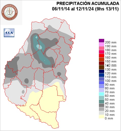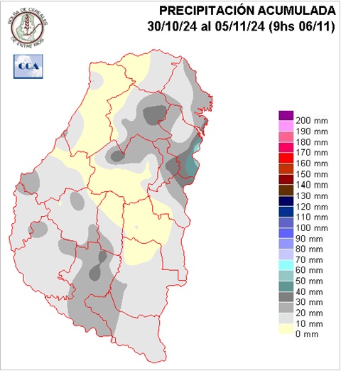 Durante la última semana, las lluvias volvieron a cubrir todo el territorio entrerriano, dando continuidad a una secuencia de eventos que se vinieron observando con regularidad a lo largo de las últimas cuatro semanas. No todos los eventos han sido de un nivel homogéneo en distribución y volumen, pero se ha sostenido un patrón más húmedo que ha permitido revertir la situación de sequía que afectaba muchos sectores de la provincia a principios de octubre. Las lluvias que se representan en el mapa se sumaron en dos episodios. El primero del miércoles para el jueves de la semana pasada y luego, con el pasaje frontal que generó el cambio ambiental durante el último lunes. Las precipitaciones del pasaje frontal fueron más generalizadas, con sectores donde el acumulado ha sido satisfactorio. Se han definido algunos corredores sobre el centro noroeste de la provincia donde las tormentas se activaron de manera más eficiente, potenciando la capacidad pluvial, con precipitaciones que duplicaron los valores medios observados en el resto de las zonas productivas. En el mapa queda claro, como los milimetrajes van cediendo hacia el sudeste, donde además del salteo de la semana pasada, este lunes no se logró superar el techo de los diez milímetros. Luego de las lluvias del lunes, las temperaturas presentaron una moderación significativa, pero ya hemos ingresado en un patrón de circulación que hará trepar las marcas térmicas a valores veraniegos. Esto ya se estará notando hoy, pero se reforzará en los próximos días alcanzando el apogeo el sábado con guarismos de máxima que superarán los 35 ºC. En la transición hacia el domingo, se espera la llegada de una nueva onda frontal. La inestabilidad que puede generar esta perturbación estará ligada a la humedad y la energía que quede latente de la jornada del sábado. En principio no se están previendo milimetrajes significativos, pero puede haber excepciones discrecionales en escala reducida.