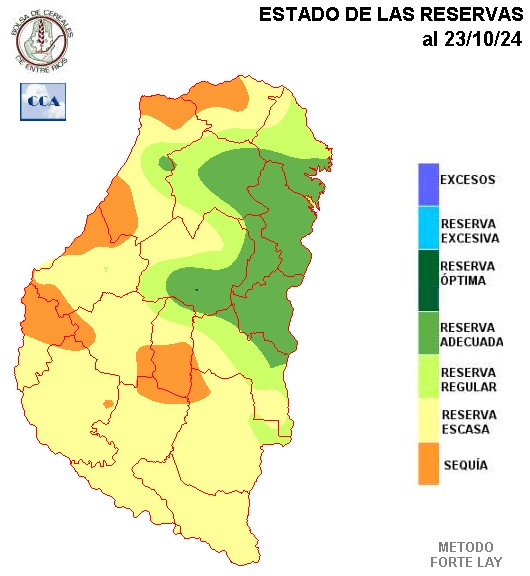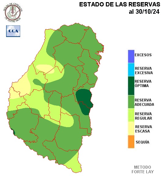 El balance hídrico se mantiene dentro de niveles aceptables, si se considera que la demanda de los cultivos recientemente implantados es incipiente. Con las últimas lluvias se dieron recargas superficiales que permiten avanzar con las tareas de siembra. En el mapa se ve un predominio de reservas regulares, pero es muy razonable pensar que la disponibilidad de humedad para la etapa actual de la campaña puede tener una lectura más optimista. Dicho esto, debemos tener en cuenta que todavía el balance hídrico depende mucho del comportamiento pluvial, las recargas profundas no necesariamente se han logrado con eficiencia y en todo caso, de haberlas, no están disponibles para cultivos en sus primeras etapas de desarrollo. La frecuencia de precipitaciones que se vino mostrando en el último mes ha sido eficiente para mantener los niveles de humedad y corregir las zonas que estaban en sequía. No obstante, el sistema está expuesto a retrocesos que pueden tener una reaparición ante condiciones térmicas más exigentes, combinados con lluvias más modestas o salteos pluviales. En particular, la semana que abordamos tiene altas chances de ser un período en que la evaporación supere a la reposición pluvial, con lo cual, es una semana que debería proyectar una situación desmejorada en el balance hídrico. Aquí es donde vemos que el sistema esta susceptible a la recurrencia pluvial. Entendemos que es posible mantener un nivel de reserva razonable con lluvias semanales, pero los salteos o los eventos modestos mostrarán una rápida señal negativa en el balance hídrico. Si se validan los pronósticos de lluvias pobres para el domingo, deberemos esperar a la última semana del mes para una nueva oportunidad pluvial más generosa. A favor, luego del pasaje frontal del domingo, las temperaturas se moderan y posiblemente se mantendrán en valores menos exigentes, lo cual mitiga la presión sobre las reservas de humedad.
