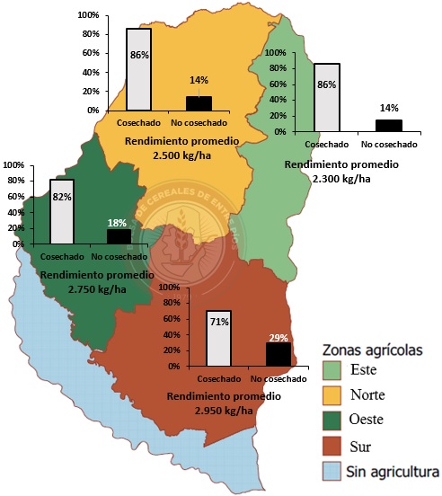 La zona con mayor rendimiento promedio es el Sur con un valor de 3.000 kg/ha, mientras que el sector Norte y Este poseen los promedios más bajos entre 2.400 a 2.500 kg/ha.