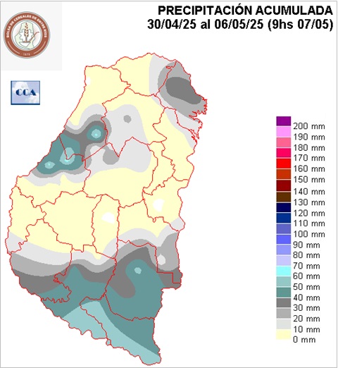 Las precipitaciones que se han observado en la última semana han sido muy modestas, mayoritariamente el miércoles de la semana pasada. Como se ve en el mapa, son apenas unos milímetros, en muchos casos lloviznas que no llegaron a marcar. A pesar de que las precipitaciones no fueron importantes, el ambiente que ha caracterizado el transcurso de los últimos siete días está lejos de la normalidad. Estamos teniendo una transición hacia el trimestre frío con fuerte circulación del noreste, lo cual sostiene masas de aire con alto contenido de humedad y temperaturas por encima de los valores normales. Vamos cerrando la primera quincena del mes de mayo con un nivel de lluvias pobre. Esto, tiene una lectura favorable para el avance de la recolección, pero está presionando a la baja las reservas. En particular durante las próximas dos jornadas tendremos un sistema precipitante destacado sobre la provincia de BA, el cual avanzara durante el sábado sobre el litoral, pero con milimetrajes que, de concretarse, no superarían los diez milímetros. Desde el domingo, los vientos del sudoeste intentarán posicionarse con mayor efectividad y tenderán a generar una mezcla ambiental más confortable, con algo más de frío. Los modelos de pronóstico de mediano plazo no presentan una mejora en la oferta de agua para la segunda quincena de mayo. Si esto se valida, tendremos un resumen mensual deficitario desde el punto de vista pluvial a nivel provincial, sin que se haya observado ningún ingreso de aire polar. Hasta ahora, el único frío fuerte se concretó a principios de abril, fue muy temporario y dispar. Los resultados de la cosecha no evidencian que aquel enfriamiento haya producido daños. Los últimos inviernos han mostrado un comportamiento irregular en la oferta de agua, en general con predominios de déficit. Esa tendencia puede verse modificada esta campaña si persiste la circulación de aire húmedo durante el trimestre frío.