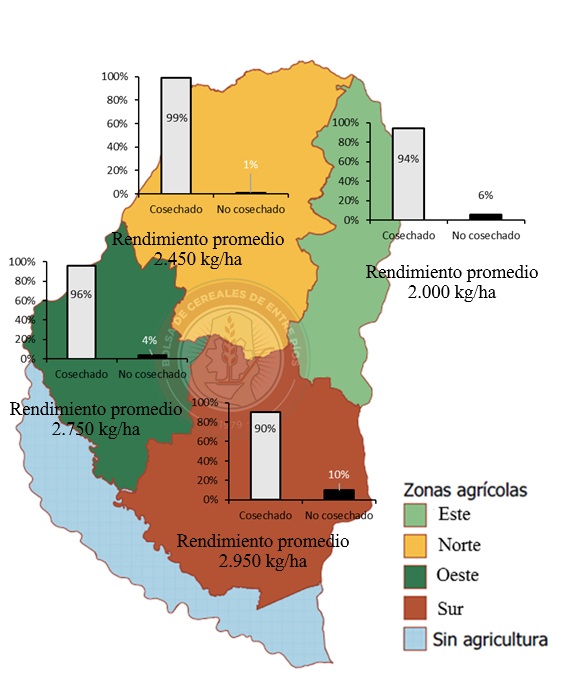 Figura 3: Avance en la cosecha de soja de segunda y rendimiento promedio por zonas en Entre Ríos.