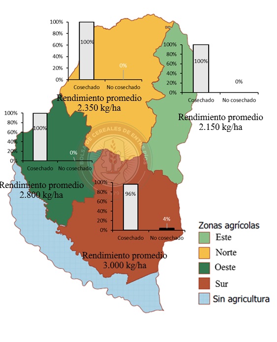 - Zonas Norte y Este: los menores rendimientos, entre 2.150 y 2.350 kg/ha.