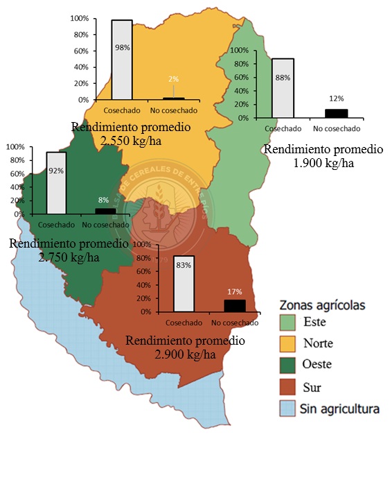 En la Figura 2 se presenta el grado de avance de la cosecha y los rendimientos promedio por zonas en la provincia. Se destaca: