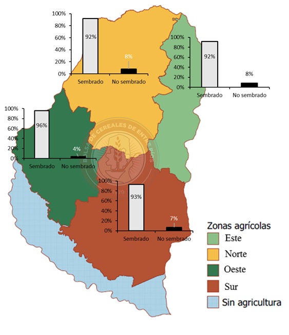 En la Figura 3 se presenta el grado de avance en la siembra del cereal por zonas dentro de la provincia.