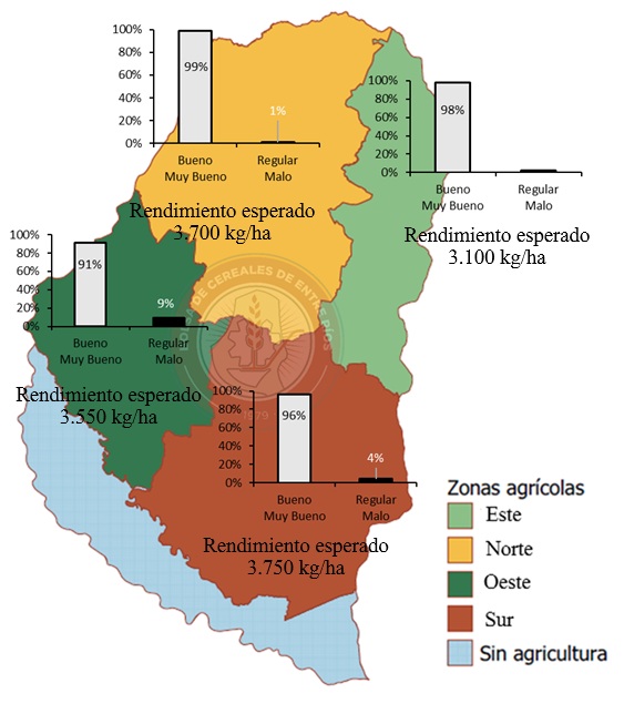 Figura 1: Condición y rendimiento estimado en el cultivo de trigo por zonas en la provincia de Entre Ríos.