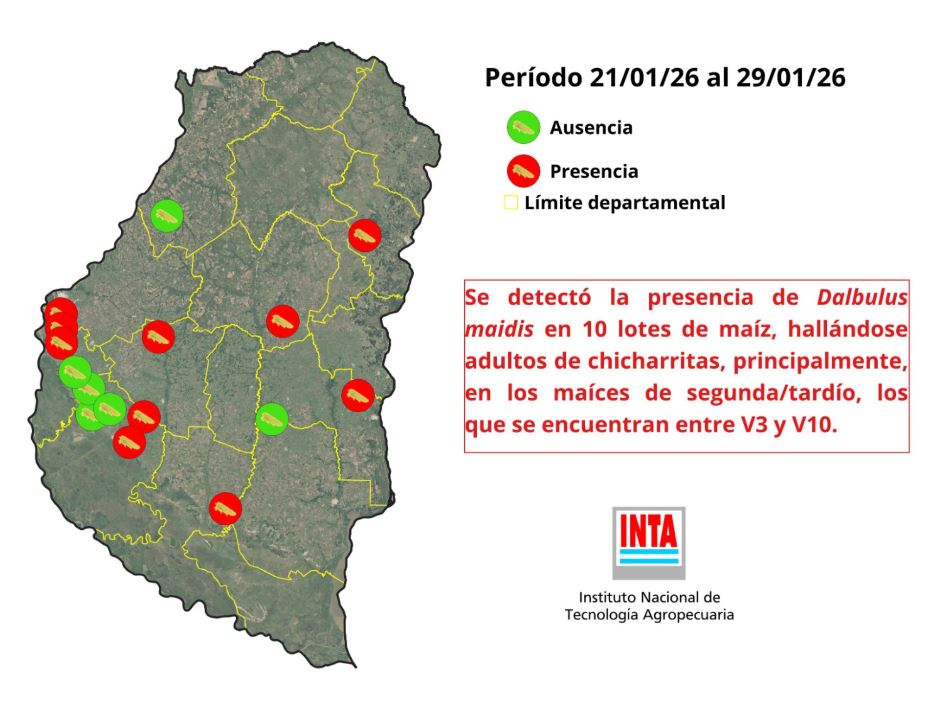 Se detectó la presencia de Dalbulus maidis en 10 lotes de maíz, hallándose adultos de chicharritas, principalmente, en los maíces de segunda/tardío, los que se encuentran entre V3 y V10. En los sitios restantes de la provincia de Entre Ríos donde se realizan los monitoreos no se observaron chicharritas, coincidiendo, en la mayoría de los casos, con cultivos de maíz en estados reproductivos (Ver mapa).