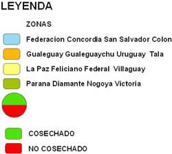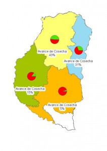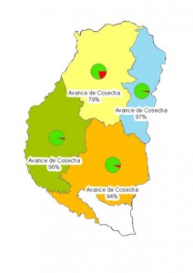 Luego de la lluvia del domingo se comenzó de lleno con la cosecha de trigo, los datos aportados por los Colaboradores reflejan variabilidad con respecto al rendimiento por hectárea y por zona. Los rindes tienen un piso de 1.000 kg/ha y algunos lotes exepcionales de 3.000 kg/ha. Hasta el momento el porcentaje de avance provincial se ubica en el 13%, el progreso a nivel zonal de las labores de cosecha se presentan en el Mapa 1. El mismo muestra que en el norte el porcentaje alcanza al 38% mientras que en el sur solo se ha podido levantar el 5%. Con respecto a la calidad, los inconvenientes mencionados son el daño causado por «Fusarium» y el bajo peso hectolítrico.