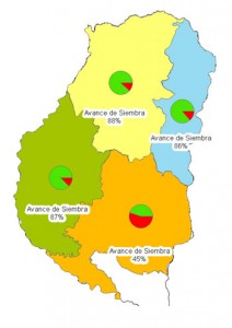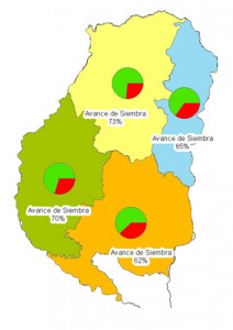 El avance de siembra de soja de primera se posiciona en el 71% de las aproximadamente 1.090.000 ha planificadas para la actual campaña. La zona sur es la más atrasada, habiendo alcanzado el 62% de su intención, debido fundamentalmente a la falta de piso que no permite el normal tránsito de las maquinarias, ver Mapa 3.
