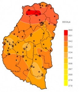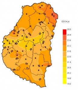 En los últimos siete días las temperaturas tuvieron un comportamiento inverso al de la semana previa. Es decir, temperaturas muy bajas al comienzo del período, cuando se registraron los valores mínimos más bajos y un significativo ascenso hacia el final, debido al ingreso de aire más cálido y húmedo que provocará un desmejoramiento de las condiciones en el inicio de la próxima semana de análisis. Como hemos dicho las marcas térmicas más elevadas se produjeron al final del período y en general los valores máximos se mantuvieron entre 32°C y 34°C. Las temperaturas mínimas fueron levemente superiores a las de la semana previa pero normales para la época, con registros entre 11 ºC y 13ºC.