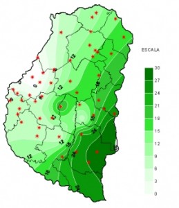 Como se observa en el mapa, la última semana de análisis ha sido mayormente seca. Una perturbación de paso muy rápido durante la jornada del domingo generó algo de inestabilidad y dejó algunas precipitaciones. Una franja que va desde el sur de Nogoyá hacia Gualeguaychú, define el sector mejor provisto. En esta franja se alinearon algunas celdas de tormenta con máxima caída de agua en la zona de influencia de Larroque. Al desplazarse hacia el este noreste, las tormenta se desorganizaron aunque en zonas de Villaguay, Colón y Uruguay se lograron superar los 10 milímetros, por cierto una oferta pobre para el mes de noviembre. Queda claro que las lluvias fueron inferiores o nulas en el resto de la provincia.