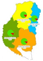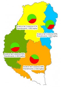 No se han detectado cambios en los rendimientos promedios, ubicándose los mismos alrededor de los 2.000 kg/ha; de mantenerse este valor la producción triguera en la campaña 2012/13 totalizaría un tonelaje final aproximado a las 330.000 tn. Este hecho implicaría una caída en la producción con respecto al ciclo agrícola anterior del 65%, produciéndose una merma cercana a las 620.000 toneladas. Los avances y rindes por zonas se presentan en el Mapa 1.