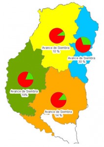 Luego de las últimas precipitaciones y aprovechando la humedad disponible en la cama de siembra se ha implantado alrededor del 17% del área destinada a soja de 2da. Los avances a nivel de zona están detallados en el Mapa 3.
