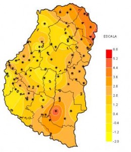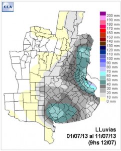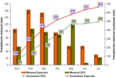 Finalmente, si se compara el valor acumulado esperado de enero a julio que es de 663 mm con lo acontecido a la fecha (acumulado enero – julio 2013 es de 495 mm), se puede apreciar un desfasaje de 168 mm, es decir una disminución de 25% aproximadamente.