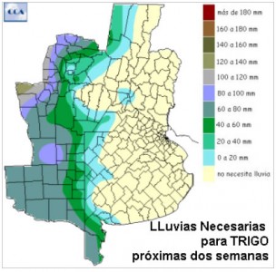Partiendo del actual balance hídrico para trigo, puede estimarse cuál es la necesidad de precipitaciones para las próximas dos semanas. No es necesario hacer cálculos sofisticados para intuir que la franja este tiene sus necesidades hídricas satisfechas, observándose una concentración de la demanda pluvial en sectores del oeste. Esta situación define un patrón difícil de quebrar en lo que resta del invierno, es decir, es poco probable normalizar el nivel de reservas en la franja mediterránea, pueden concretarse mejoras, pero deberían observarse eventos como el recientemente acaecido en el sudoeste de Buenos Aires para que se concrete una mejora destacada en zonas con potencial triguero de Córdoba. La demanda de agua necesaria como para que se recomponga el perfil en el oeste es improbable de ser satisfecha, consecuentemente las expectativas para el desarrollo favorable de la actual campaña de trigo deben posicionarse mirando al este y sobre todo al sur de Buenos Aires.