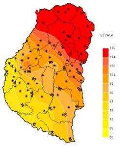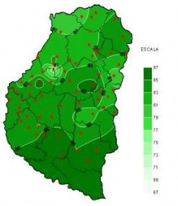 Las reservas adecuadas predominan en el cálculo que arroja el balance hídrico estimado para una pradera. Aparecen áreas reducidas del oeste con mejor disponibilidad de humedad, e incluso excesos sobre zonas del centro este y el extremo noreste. La franja de reservas regulares se ha acotado en el norte, aunque no ha desaparecido.