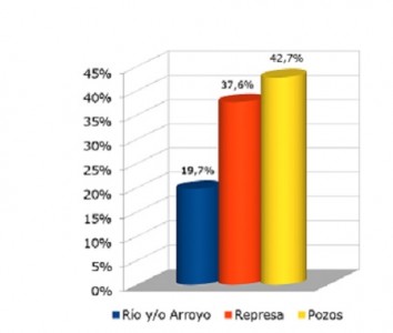 En segundo lugar se ubicó, con un 38 % la superficie regada por agua de Represas y el 19 % restante le pertenece a aquellas chacras que obtienen el agua mediante Ríos y/o Arroyos. (Gráfico Nº 1).