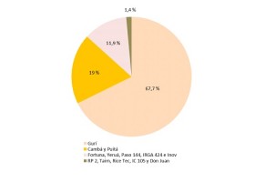 La variedad Gurí fue la que más representación tuvo ocupando aproximadamente un 68% del total del área encuestada, siendo además el que mayor crecimiento tuvo si se lo compara con la campaña anterior, en la cual solo ocupó un 6,2% del área sembrada.