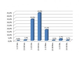 Como se puede apreciar en el Gráfico Nº 2, la mayor parte de las chacras tuvieron su emergencia en el mes de Octubre y dentro de éste principalmente en la segunda quincena. Dato muy importante ya que permite que la floración y el llenado de grano se ubiquen en una fecha con condiciones climáticas óptimas para dichas etapas fenológicas, factor clave para obtener rendimientos máximos.