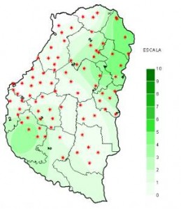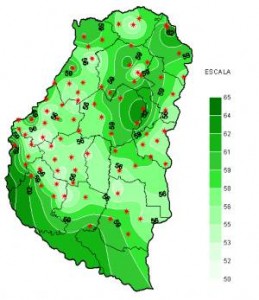La situación de humedad edáfica para toda la región pampeana, incluyendo obviamente la Provincia de Entre Ríos, y para el cultivo soja (donde se han considerado sus coeficientes hídricos específicos) hasta el día 20 de diciembre se muestra en la Figura 1. Puede observarse que había buena disponibilidad de humedad en todo el perfil del suelo, PERO ESTE PERIODO DE ALTAS TEMPERATURAS HA PRODUCIDO UN DESECAMIENTO SUPERFICIAL (que no está representado en el mapa) que PROVOCÓ DOS HECHOS: EL PRIMERO ES EL DE UN EFECTO NO DESEABLE EN LOS CULTIVARES CON EMERGENCIA Y EL SEGUNDO COMPRENDE UNA DIFICULTAD PARA LAS SIEMBRAS TARDIAS, claro que esto se debe aplicar ya a escalas más chicas dependientes de los suelos y por lo tanto de algunas subzonas de la región pampeana.