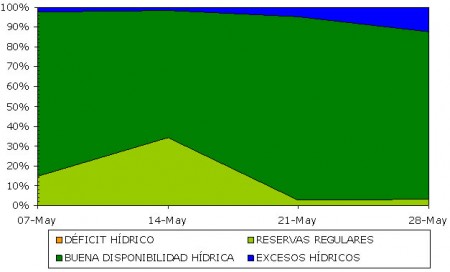 Al 7 de mayo, el 15% del territorio contaba con reservas regulares, el área con buena disponibilidad hídrica abarcaba el 83% y existía un 2% con excesos hídricos.