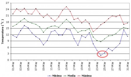 Considerando que el sensor de temperatura se encuentra al abrigo meteorológico y a una altura de 1,5 m, es muy probable que los días 24 y 25 fueran los días donde se hayan producido heladas de mayor intensidad.