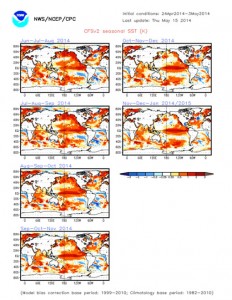El factor de análisis más significativo lo da la instalación de un NIÑO y para comprobarlo mostramos UN PRONOSTICO DE LA NOOA, en el que se observa como podemos llegar a fin de año con un NIÑO DE UNA INTENSIDAD MODERADA! La Figura 1 (NOOA, mayo 2014) muestra lo que acabamos de escribir. Observar las anomalías positivas de temperatura superficial del mar hasta el trimestre nov-dic-enero 2015.