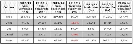 El siguiente cuadro compara los datos estadísticos finales de trigo, colza, lino, girasol y arroz de las dos últimas campañas agrícolas en Entre Ríos.