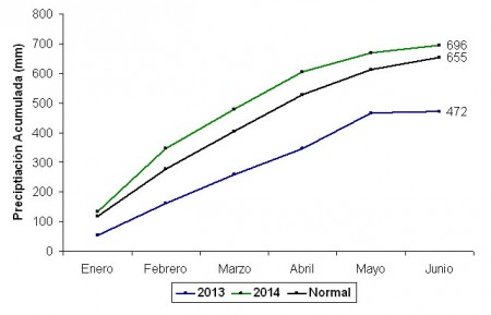 El año 2014 se ha presentado con lluvias levemente superiores a las normales, existiendo un acumulado en los 6 primeros meses del año de 696 mm versus 655 mm esperados, lo cual arroja un saldo positivo de 41 mm. Ver gráfico 1.