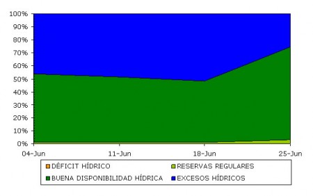 Al evaluar la evolución de las reservas hídricas durante el mes de junio se observa que hasta el 18 de junio alrededor del 55% de la geografía entrerriana contaba con buena disponibilidad hídrica y el 45% restante presentaba excesos hídricos.