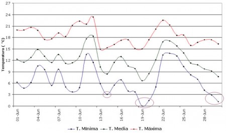 Los días en los cuales se detectaron heladas fueron: sábado 14, jueves 19, viernes 20, domingo 29 y lunes 30; siendo el jueves 19 el día más frío del mes de junio.