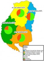 Con un progreso del 68% ya se alcanza una superficie aproximada de 212.000 ha implantadas en la Provincia. La zona oeste, que abarca los departamentos Diamante, Nogoyá, Paraná y Victoria es la que presenta un mayor avance con un 77% y la este sólo un 52% (Colón, Concordia, Federación y San Salvador), lo cual es coincidente con el estado de las reservas hídricas. Ver mapa 3.