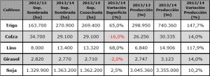 El siguiente cuadro compara los datos estadísticos finales de trigo, colza, lino, girasol, arroz y soja de las dos últimas campañas agrícolas en Entre Ríos.