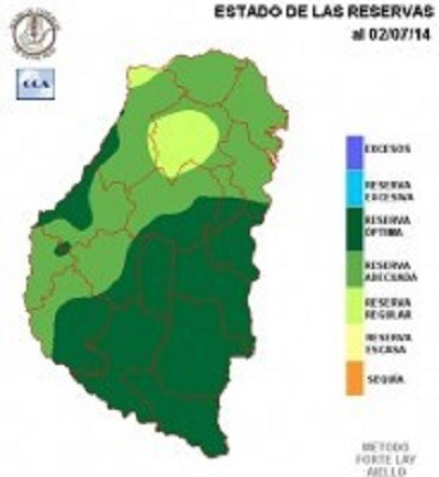 Hacia finales del mes la reducción de las precipitaciones (fundamentalmente en el oeste) permitieron que decreciera el área con reservas excesivas y se presente un escenario con reservas hídricas óptimas.