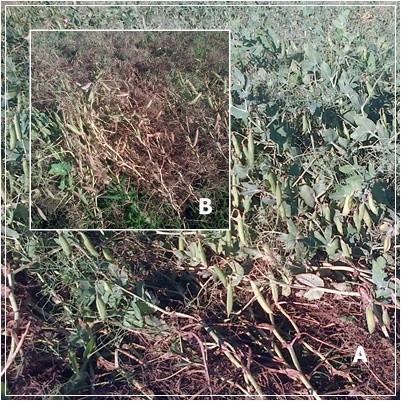 Las elevadas temperaturas ocurridas la semana anterior han afectado una proporción importante de las aproximadadamente 5.000 hectáreas dedicadas a la leguminosa en la provincia, observándose plantas secas en rodales (Foto N° 2 B). Cabe destacar que el cultivo se encuentran en el período crítico de llenado de granos, donde se define el número final de semillas y peso de las mismas por unidad de superficie (Foto N° 2 A)