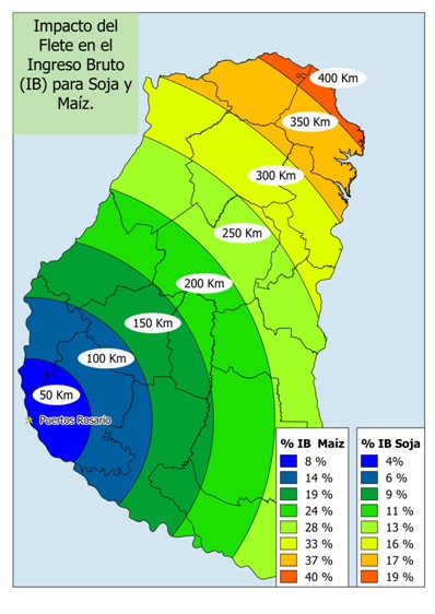 Para clarificar el costo de transporte se diseñó el Mapa Nro. 1 que refleja el incremento del gasto necesario para transportar 1 tonelada de maíz o soja al puerto de Rosario; claramente se observa que el impacto en el ingreso bruto aumenta a medida que nos alejamos en dirección noreste.