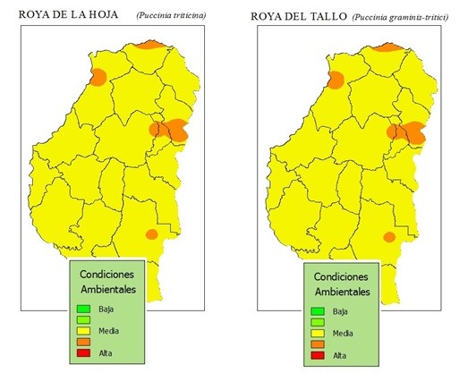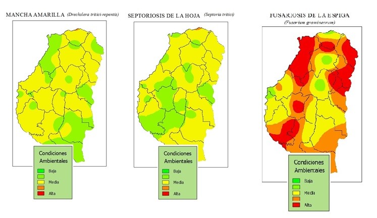 La Bolsa de Cereales de Entre Ríos, Campo Global e INTA-EEA Paraná informa el alerta por riesgo climático para las diferentes enfermedades del trigo. El análisis de determinadas variables climáticas muestra condiciones restrictivas para enfermedades foliares, específicamente por la escasa duración del mojado foliar. Las temperaturas estuvieron en los rangos óptimos para el desarrollo de las enfermedades foliares en la mayoría de las estaciones meteorológicas, lo que permitió definir un riesgo moderado (color amarillo). Para fusariosis de la espiga (Fusarium graminearum) en 9 de 11 estaciones, se alcanzó una humedad relativa promedio del 70% y un mojado de espigas por más de 48 h, lo que determinó un riesgo alto (color rojo) para ciertas áreas de la provincia de Entre Ríos. Similar a lo ocurrido en el año 2013 es un año con prevalencia de las royas sobre las manchas foliares.