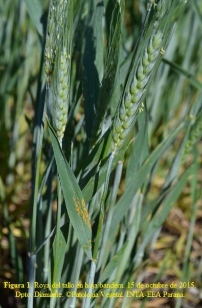 El monitoreo por los Dptos. Nogoyá, Victoria, Diamante y Paraná mostró la prevalencia de mancha amarilla, pero con muy baja severidad, con algunas excepciones donde la severidad superó el 10% de área foliar afectada. Sin embargo, la roya de la hoja (Puccinia triticina) se determinó con alta incidencia y severidad en los lotes de producción. La roya del tallo (Puccinia graminis-tritici) se encontró en más del 30% de lotes monitoreados, con la incidencia y severidad bajas posiblemente por la restricción de temperaturas bajas; lotes sembrados con variedades susceptibles están muy afectados en hojas y tallos (Figura 1). Una variedad muy sembrada en esta campaña conocida como resistente a roya del tallo, aparece con niveles muy altos o muy bajos en áreas próximas, lo que requiere definir con precisión la identidad del genotipo y exige seriedad y responsabilidad por parte de quienes trabajamos en el sector agrícola.