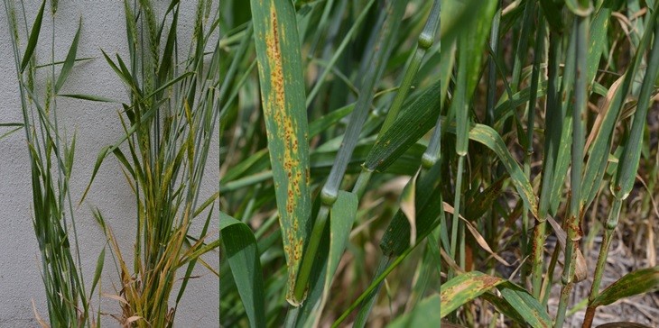 El monitoreo realizado en los Dptos. Diamante y Paraná mostró la prevalencia de mancha amarilla en hojas inferiores, pero con baja severidad, sin afectar las hojas superiores, con pocas excepciones. Sin embargo, la roya de la hoja (Puccinia triticina) se determinó con alta incidencia y severidad en los lotes de producción sembrados con genotipos susceptibles (Figura 1). La roya del tallo (Puccinia graminis-tritici) incrementó su severidad en variedades susceptibles (Figura 2).