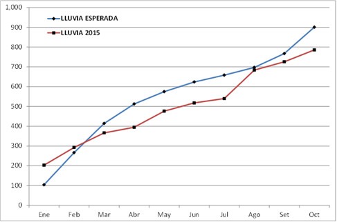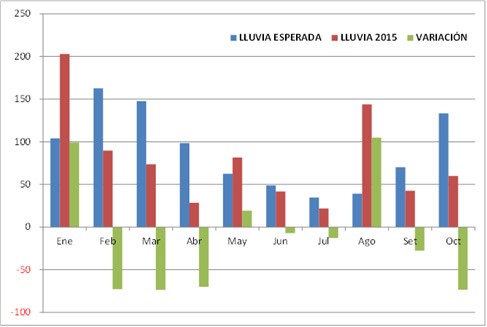 El monto acumulado promedio normal o esperado en la región para los primeros 10 meses se ubica en 900 mm; mientras que hasta el 20 de octubre la lluvia acumulada promedio se sitúa cercano a 800 mm, lo cual representa una variación negativa de 100 mm o expresado en porcentaje una disminución del -11%.
