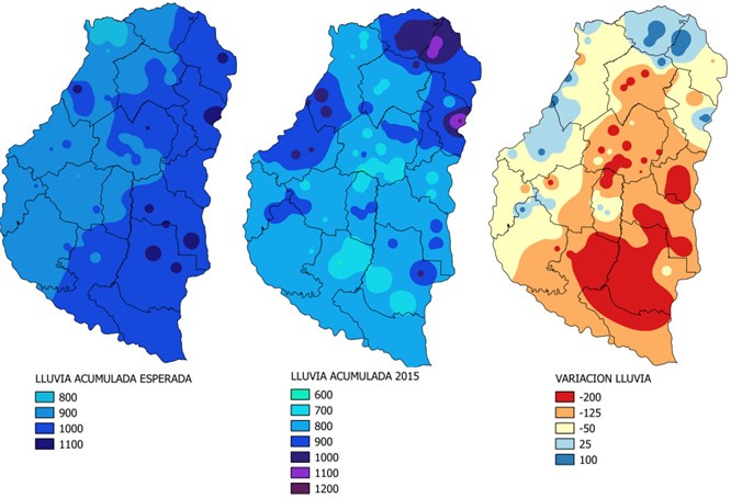 Finalmente al restar los mapas de la lluvia acumulada esperada versus lo acontecido al 20 de octubre del 2015 se aprecia que el centro sureste presenta un régimen deficitario que oscila entre -200 mm a – 125 mm y una sobreoferta de escasa magnitud se detecta en áreas de los departamentos Paraná, La Paz, Feliciano y Federación donde el acumulado supera entre 25 mm a 100 mm al esperado.
