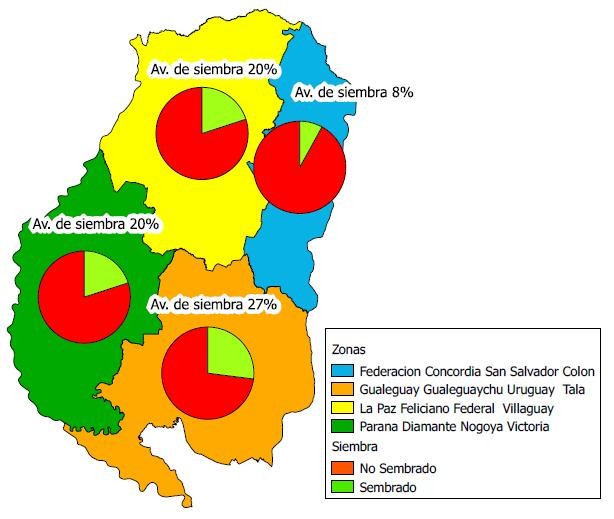 Las lluvias del jueves pasado han sido generosas sobre el área del sudoeste provincial, es decir sobre la zona donde se ha concretado la mayor implantación de granos finos, los cuales necesitaban esta ayuda pluvial para cerrar favorablemente la floración. Las precipitaciones cubrieron todo el territorio con milimetrajes disímiles, pero con vastos corredores que lograron superar los 30 milímetros. En el mapa se aprecia un mínimo en el centro del departamento Federal, el cual posiblemente se deba a que sobre la zona se haya ubicado un centro de baja presión, con su rama más activa sobre el noreste de este departamento y su zona de menor dinámica del centro para el sudoeste. Las lluvias se incrementaron sobre el departamento La Paz y han permitido poner freno al incipiente avance de una zona de sequía.