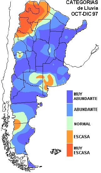 Durante el último trimestre del 97 el indicador del Pacífico Ecuatorial se posicionaba en el mismo sentido e intensidad, sin embargo la influencia sobre las lluvias al cabo de todo el trimestre fue mucho más extendida, incluye el área donde se ha producido la anomalía positiva del trimestre pasado, pero se destaca un comportamiento muy homogéneo extendido a la zona núcleo. Evidentemente por entonces el factor de escala planetaria superaba las influencias de forzantes de la circulación regional.