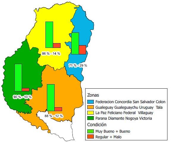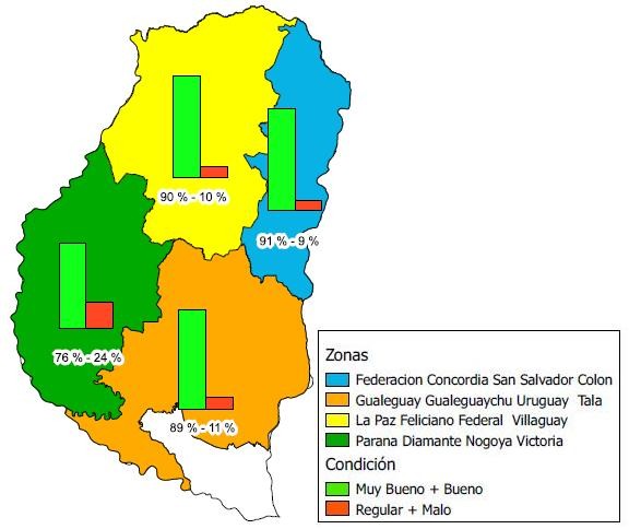 En la situación muy buena existe un 23%, concentrándose la mayor parte del área en un estado de bueno con el 61% y el 1% restante como mala. En el Mapa N° 1 se detalla la condición por zonas en la provincia, donde se destaca la situación más complicada en el oeste del territorio.