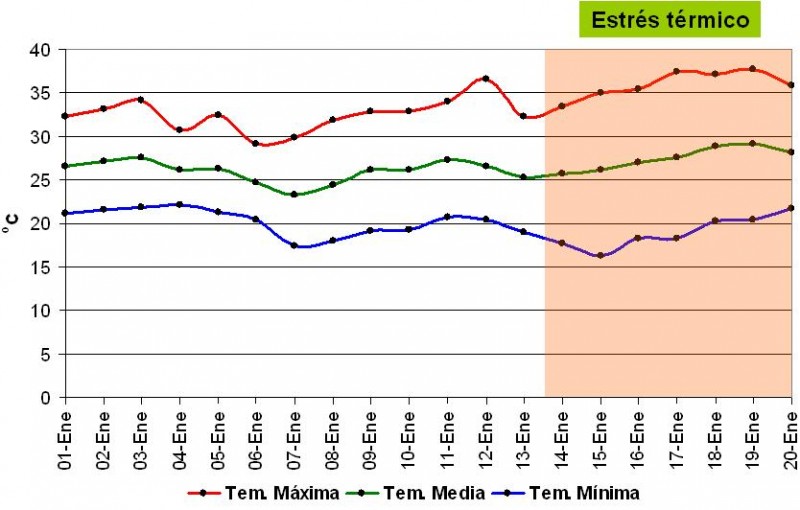 Tal como puede apreciarse a partir de la segunda quincena se produjo un incremento de los valores máximos diarios, superando los 35°C generando un estrés térmico en los cultivos de maíz que están en plena floración y en soja, lo cual impactaría negativamente en el rendimiento.