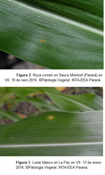 Las enfermedades determinadas con niveles muy bajos son tizón foliar (Exserohilum turcicum) en La Paz, San Salvador y Hasenkamp (Dpto. Paraná) (Fig. 1) y roya común (Puccinia sorghii). Ésta roya fue detectada en Victoria con una Incidencia del 70% y en Sauce Montrull (Dpto. Paraná) con un 30%. La roya común para infectar al maíz requiere alta humedad relativa, agua libre sobre la hoja, y temperaturas entre 16 y 23°C. Cuando las condiciones climáticas son poco favorables como las actuales, la evolución es muy lenta, de allí que las severidades observadas sean muy bajas (Fig. 2).