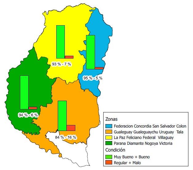 La condición general del cultivo en la provincia se presenta en un 8% como muy buena, 84% buena y 8% regular. Al igual que para maíz de segunda y/o tardío, lotes de sorgo en condición regular se deben principalmente al estrés hídrico del mes de enero, pero este cultivo tiene mayor capacidad de recuperación. Mapa Nº 2, condición de sorgo por zonas en Entre Ríos.